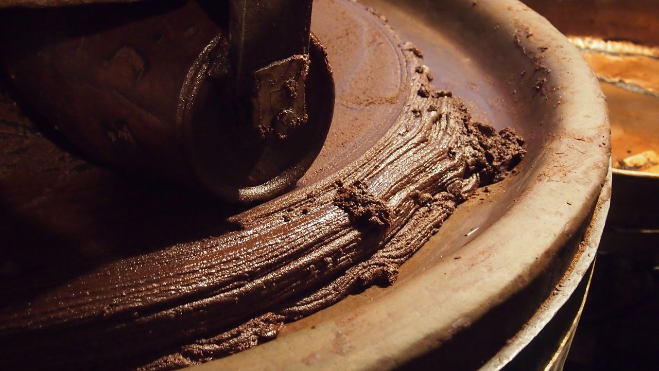 木のローラーで擦り潰されて練られていくチョコレートペースト、味見させていただきましたが