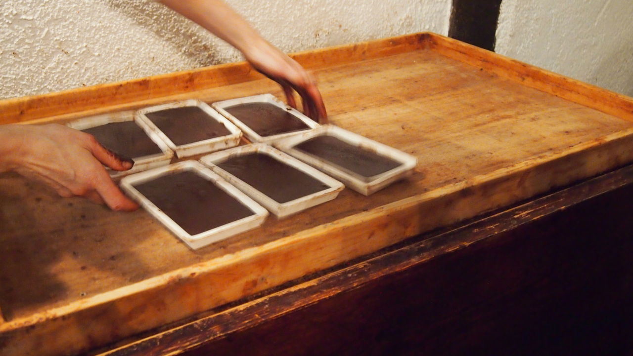 この大きな木のトレイに乗せて下の台を振動させると、タブレットになるチョコレートの中の空気を抜きながら